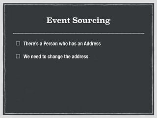 The document discusses event sourcing in Ruby, emphasizing its advantages over traditional CRUD operations by improving data auditability and enabling business-oriented development. It presents an implementation example for handling shopping cart item removal using event sourcing and provides resources for further learning. The document highlights the importance of identifying domain state changes and the relevance of event sourcing in legacy applications.