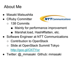 The document discusses a presentation by Masaki Matsushita on integrating Go with Ruby, specifically focusing on the Go 1.5 feature 'buildmode c-shared' for creating shared libraries. It covers the use of cgo to call Go functions from Ruby using libraries like FFI and Fiddle, along with practical examples and techniques to avoid unnecessary string copies and manage memory. The presentation also includes guidance on writing Ruby extension libraries using Go and how to create a Ruby gem that includes Go code.