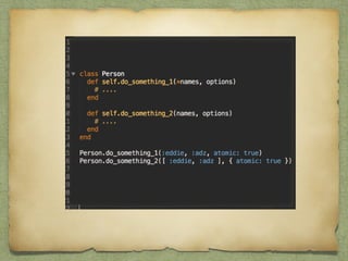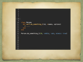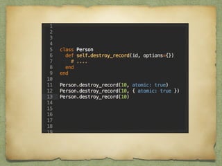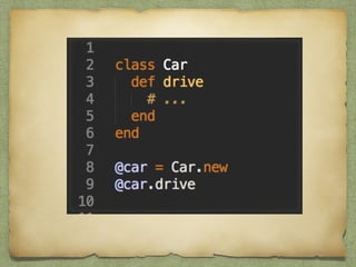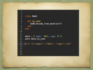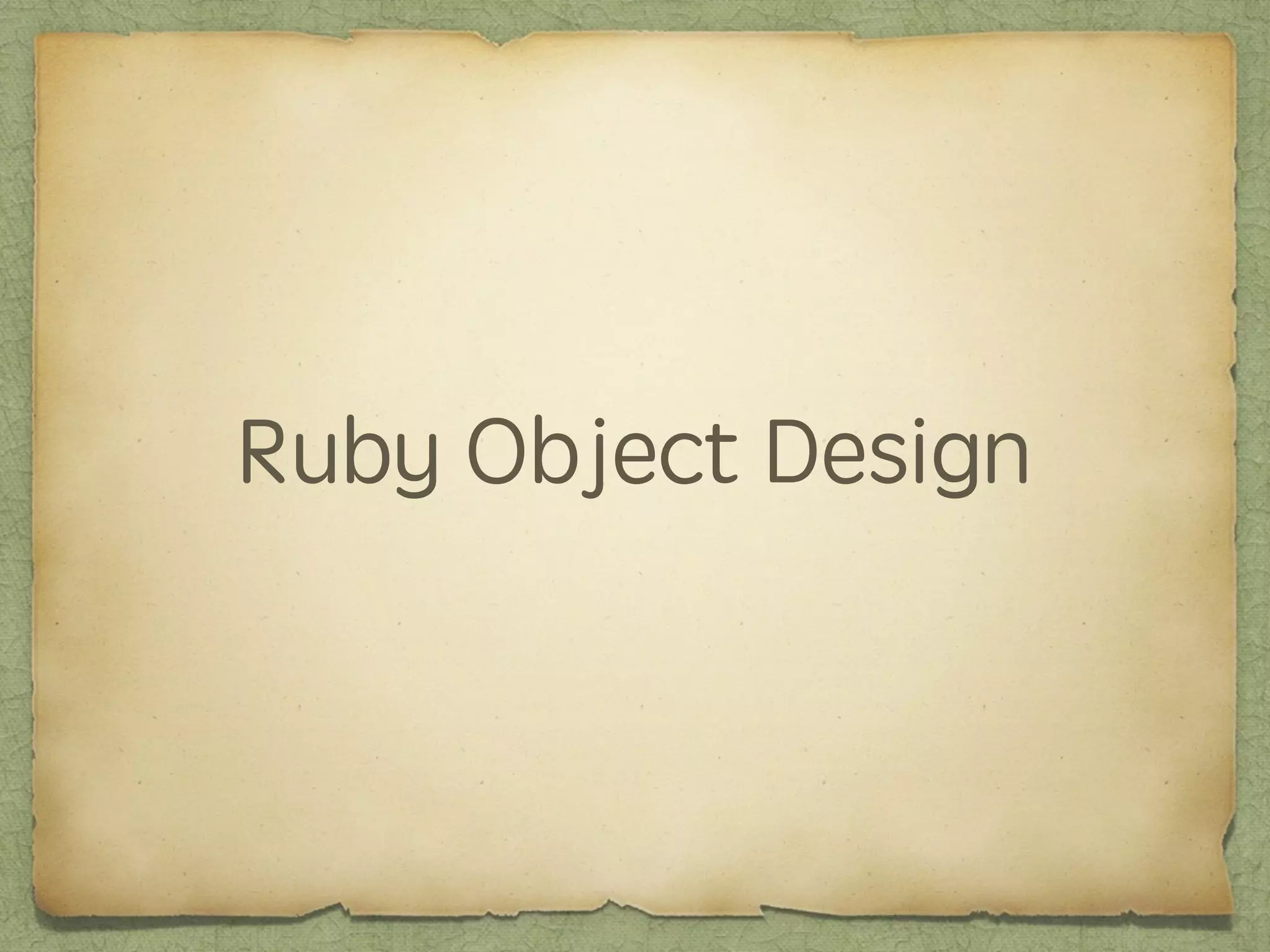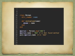 This document discusses key differences between Ruby objects and objects in other languages. It covers 7 main points: 1) Ruby allows syntax omission; 2) Ruby uses accessor methods instead of properties; 3) operators are methods; 4) Ruby supports open classes; 5) Ruby enables meta-programming through techniques like class_eval; 6) Ruby uses modules for multiple inheritance and mixins; 7) Ruby does not enforce private and protected on methods. The document provides pros and cons for each point and emphasizes how Ruby's flexibility allows for cleaner business logic, increased productivity, and following the DRY principle through meta-programming and modules.