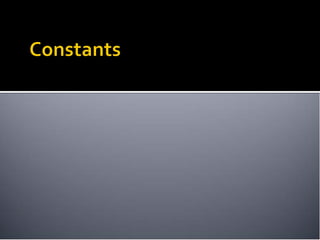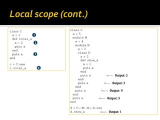 This document provides an overview of key concepts in Ruby including variables, methods, classes, modules, inheritance and scope. It discusses local variables, instance variables, class variables and global variables. It explains how methods are defined and called in Ruby. It describes classes and modules, and how modules can be mixed into classes. The document also covers inheritance, constants, self, and singleton methods. It provides details on variable scope and how Ruby determines an identifier is a variable, keyword or method call.