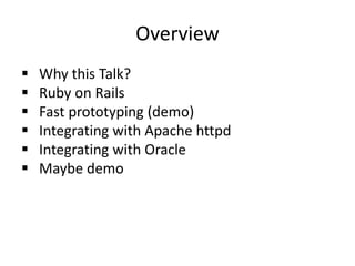 This document provides an overview of Ruby on Rails, Apache httpd, and Oracle. It discusses why Ruby on Rails is useful for rapid prototyping, and how it can be integrated with Apache and Oracle. The document demonstrates Rails generators, routing, testing with RSpec, and security features. It also outlines how to configure Apache and link Rails to an Oracle database. The presenter provides cheat sheets for creating a sample Rails application integrated with Devise, ActiveAdmin, and a database, with minimal code required. The key takeaway is that learning is fun through experimenting with different technologies.