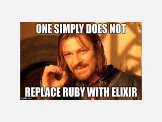 The document discusses the comparison between Ruby and Elixir, highlighting Elixir's advantages such as Ruby-like syntax and better performance for scalable systems, while acknowledging Erlang's limitations. It covers various aspects such as frameworks (Phoenix for Elixir, Rails for Ruby), dependency management, and code examples for routing, controllers, models, and unit testing. Additionally, it presents performance benchmarks indicating Elixir's capability for high-availability systems and real-time connections.
