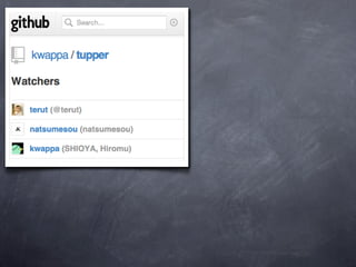 This document summarizes a presentation about moving from a legacy development approach to an agile development approach. It discusses topics like social coding and the agile manifesto after 10 years. It also introduces the Tupper gem for processing uploaded files via web forms. The presentation concludes that social coding is the way to the Rubyist's way and thanks attendees for listening.