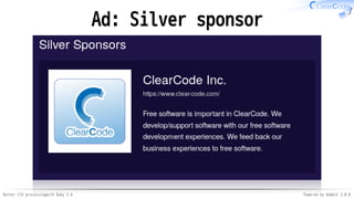 The document discusses improvements in CSV processing with Ruby 2.6 powered by Rabbit 3.0.0, highlighting performance enhancements in parsing and writing CSV data. It covers various benchmarks, including speed comparisons with previous versions and new parsing features. The presentation emphasizes backward compatibility and maintenance ease while introducing new functionalities such as escaping characters and lazy initialization.