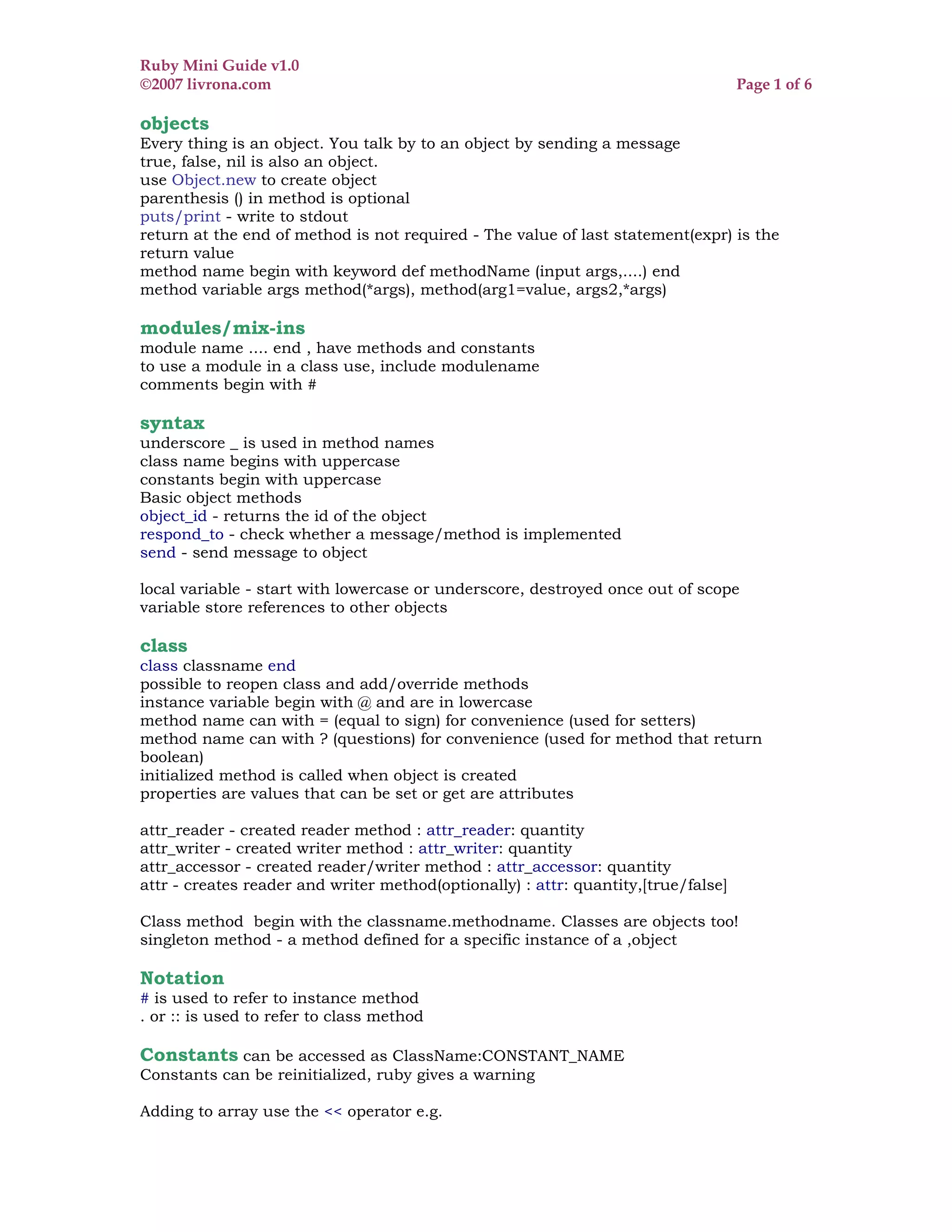 - Classes are defined using class, modules using module, and objects are created using Object.new