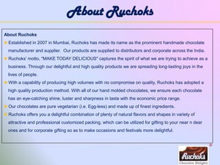 Ruchoks is a manufacturer of handmade chocolates established in 2007 in Mumbai that offers over 100 varieties of chocolates and innovative packaging options. They have robust infrastructure and quality controls to produce large volumes of chocolates while maintaining high quality. Ruchoks aims to spread joy through their delicious chocolates and provide options for corporate and individual gifting across various price points and customization options.