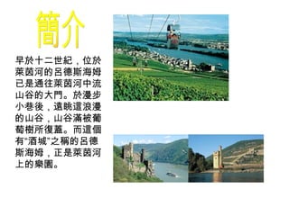 呂德斯海姆是通往萊茵河中流山谷的大門,以其浪漫的景致和酒城著稱。主要景點包括葡萄酒博物館、音樂盒博物館以及著名的畫眉鳥巷,游客还可乘坐缆车前往尼德森林纪念碑欣赏美景。交通方面,从法兰克福机场出发,约需一小时的火车或乘坐游轮从科布伦茨出发的航班。