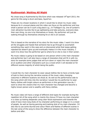 The document discusses plans for a music video to accompany the song "Rudimental - Waiting All Night" by Ella Eyre. It describes choosing unusual locations in London like Trafalgar Square to show the performer as an outcast among the crowds. The narrative will show the struggles of an undiscovered artist getting rejected but not giving up until achieving success in the music industry. Various characters like audition judges will be included, and the main character's clothing will evolve from casual to flashy to represent their change in fortune. Different shot types like close-ups and long shots will be used to tell the story and show the difference before and after the performer's big break.