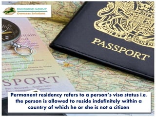 Rudraksh Group Overseas Solutions is a leading immigration consultancy specializing in immigration services. The document explains that permanent residency refers to a visa status allowing individuals to reside indefinitely in a foreign country. It highlights the consultancy's focus on meeting clients' immigration needs.