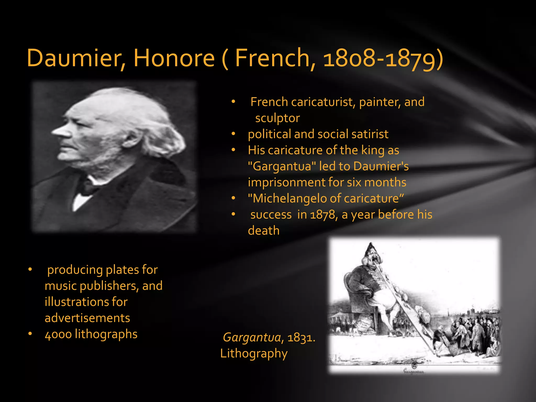 This document provides information about the lithograph "Rue Transnonian" by French artist Honoré Daumier from 1834. Daumier was a French caricaturist, painter, and sculptor best known for his political and social satires. He was imprisoned for six months for his caricature of the king as "Gargantua." Daumier produced over 4,000 lithographs in his career and was considered the "Michelangelo of caricature," finding success up until his death in 1878 working on illustrations and advertisements.