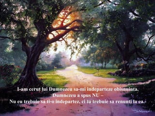 Documentul conține o serie de cereri adresate lui Dumnezeu, fiecare răspuns evidențiind ideea că schimbarea personală și creșterea spirituală sunt responsabilități individuale. Răspunsurile divine sugerează că suferința, răbdarea și fericirea sunt înstincte interioare și nu daruri externe. La final, recunoașterea iubirii divine este prezentată ca o întoarcere la calea corectă.