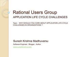 This document discusses the challenges of application lifecycles in organizations and possible solutions. It notes that application development has become more complex over time due to improvements in hardware, software, integrated development environments, and processes. This complexity is multi-dimensional and makes lifecycle management difficult. The author provides their experience in the automotive industry to illustrate these challenges, including issues with requirements, testing, integration, tools, and personnel. Finally, the document suggests that organizations need an integrated platform rather than just IDEs to manage the entire software lifecycle and development process in a standardized way.