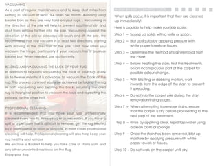 The document provides care instructions for hand-crafted rugs, emphasizing the importance of maintenance practices such as regular vacuuming, rotating the rug, and professional cleaning every few years. It includes a detailed stain treatment guide, outlining steps and specific recommended cleaning solutions for various types of stains. Additional advice on handling shedding and the benefits of sunlight exposure for maintaining rug health is also included.