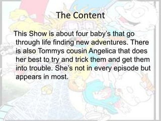 This document provides an overview of the children's television show Rugrats. It discusses that the show follows the adventures of four babies, Tommy Pickles, Chuckie Finster, Lil Deville, and Phil Deville, and their cousin Angelica who tries to get them into trouble. Each 30-minute episode consists of two 11-minute stories that depict the babies dealing with an issue or problem. The show features childish humor and language designed to entertain young children.