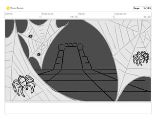 The document appears to be a storyboard or script for a multimedia project. It consists of multiple scenes with panels and dialogue. In the first scene, the characters Val and James explore some Incan temples that Val finds filthy. Later, their torchlight reveals they have accidentally started a fire due to spiderwebs being flammable. They try to escape the fire and swarms of spiders through the ancient ruins.