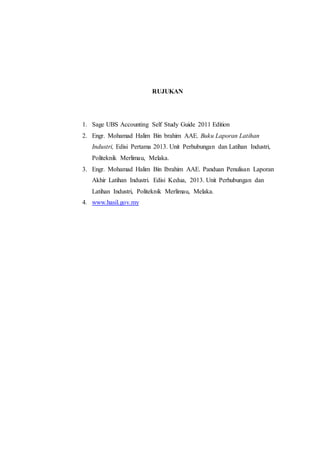 Dokumen ini merujuk kepada beberapa sumber berkaitan panduan latihan industri dan penulisan laporan. Terdapat rujukan kepada edisi 2011 daripada Sage Ubs dan beberapa edisi buku oleh Engr. Mohamad Halim bin Ibrahim. Juga disertakan adalah laman web rasmi Lembaga Hasil dalam konteks maklumat berkaitan latihan industri.