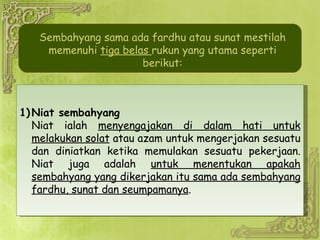 Sembahyang mesti memenuhi 13 rukun utama termasuk niat, berdiri (bagi yang mampu), takbiratul ihram, membaca Al-Fatihah, ruku, sujud, duduk antara dua sujud, membaca tahyat akhir dan selawat, serta memberi salam. Rukun-rukun ini dibahagikan kepada rukun qalbi, qauli dan fi'li.