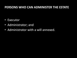 This document outlines the rules regarding who can administer an estate under Philippine law. It discusses the different types of authority that can be issued: letters testamentary to an executor named in a will; letters of administration to someone administering an intestate estate; and letters of administration with a will annexed if the executor is incompetent. It details who is competent to serve as an executor or administrator, such as a resident adult, and who is not, like a minor. It also addresses related issues like whether a married woman can serve, what happens if co-executors are disqualified, and the scope of an administrator's authority.