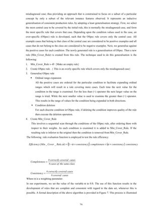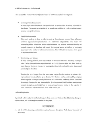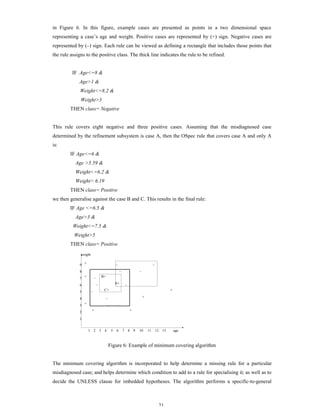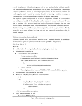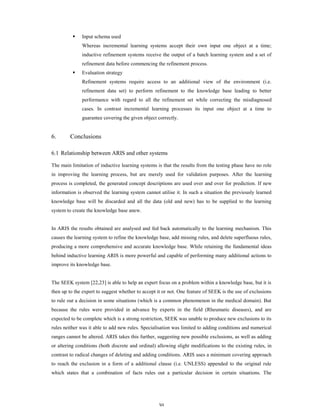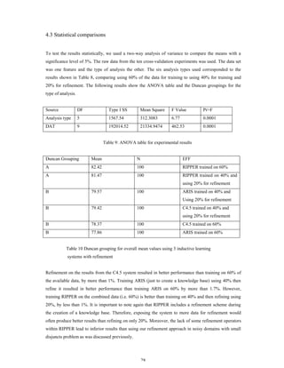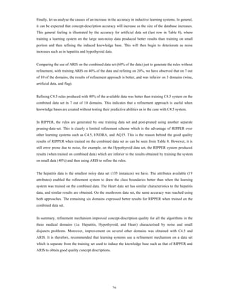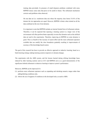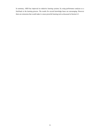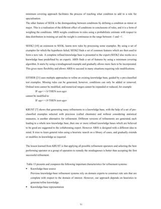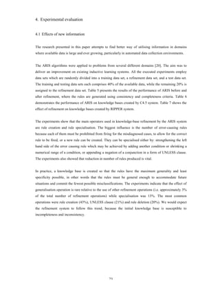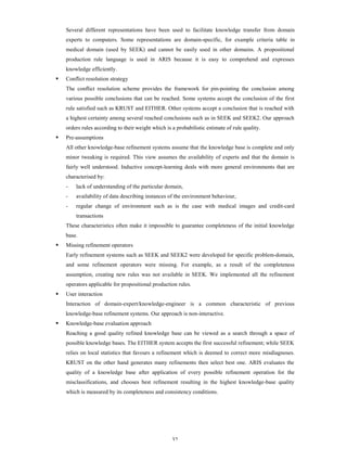 This document summarizes a paper about refining inductive knowledge-based systems through empirical methods. It describes a system called ARIS that interleaves learning and performance evaluation to allow accurate classifications on real-world datasets. ARIS employs an ordering of rules according to their learned weights, which are calculated using Bayes' theorem. The system focuses rule analysis and refinement by heuristics. It has been used to refine knowledge bases from C4.5 and RIPPER, showing improved accuracy and the ability to gradually enhance the knowledge base during refinement.