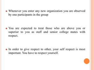 When entering a new organization, you should treat superiors with respect. To give respect to others, you must first respect yourself. Some rules to follow include being disciplined, punctual, and having decent behavior. When interacting with others, consider their cultural customs with greetings and addressing people appropriately. Manners are important, such as avoiding talking with food in your mouth at the dining table. In the classroom, students should keep it clean and not move or displace furniture. Mobile phones are not permitted inside the college campus.