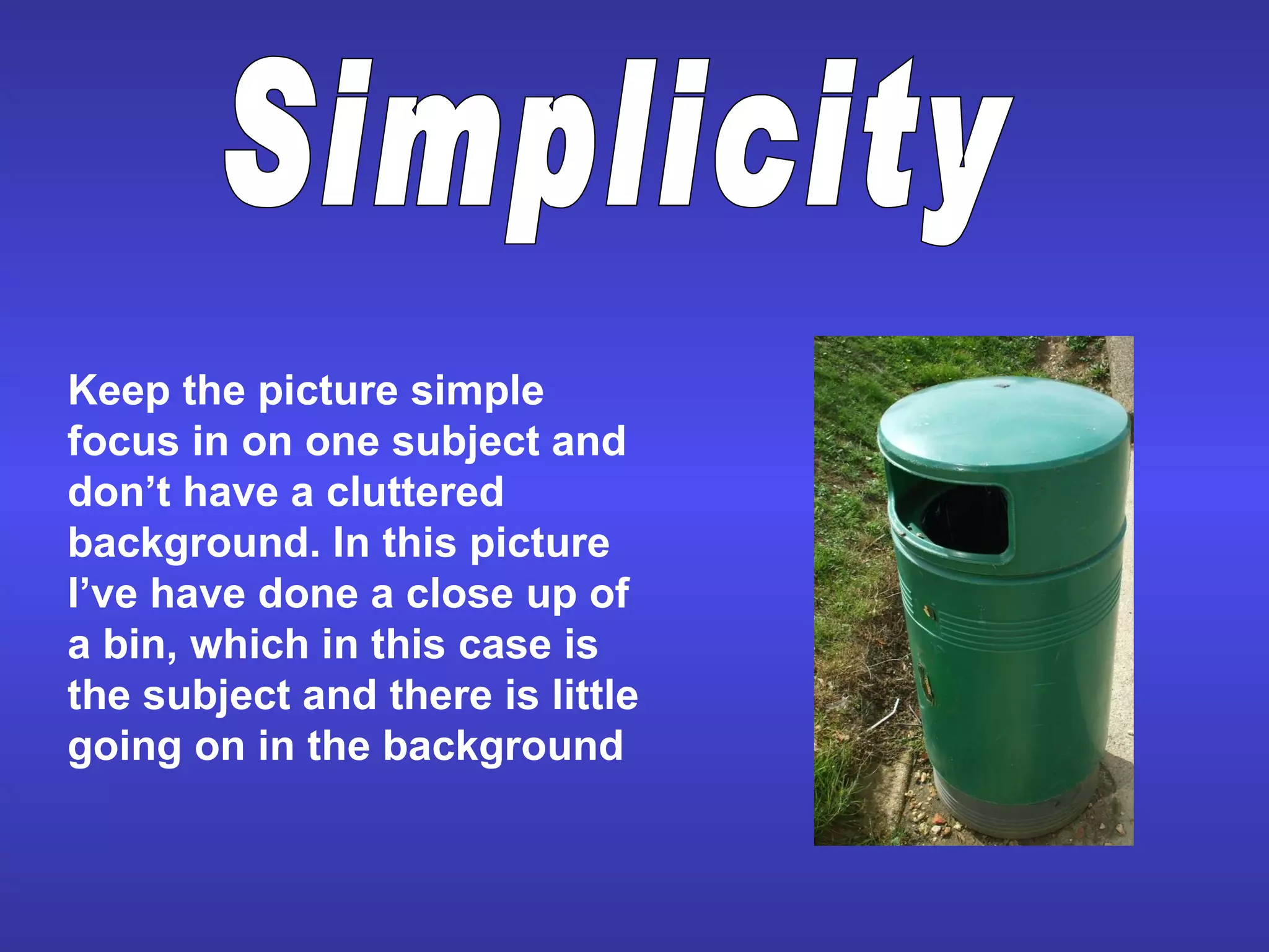 The document provides tips for composing photographs based on established composition rules. It recommends keeping images simple with a single clear subject and uncluttered background. For proper placement of the subject, it advises following the rule of thirds by positioning the subject off-center along imaginary lines that divide the frame into thirds. Framing involves using background elements to create borders around the subject. Balance is created by contrasting light and dark areas. Leading lines guide the viewer's eyes toward the main subject.