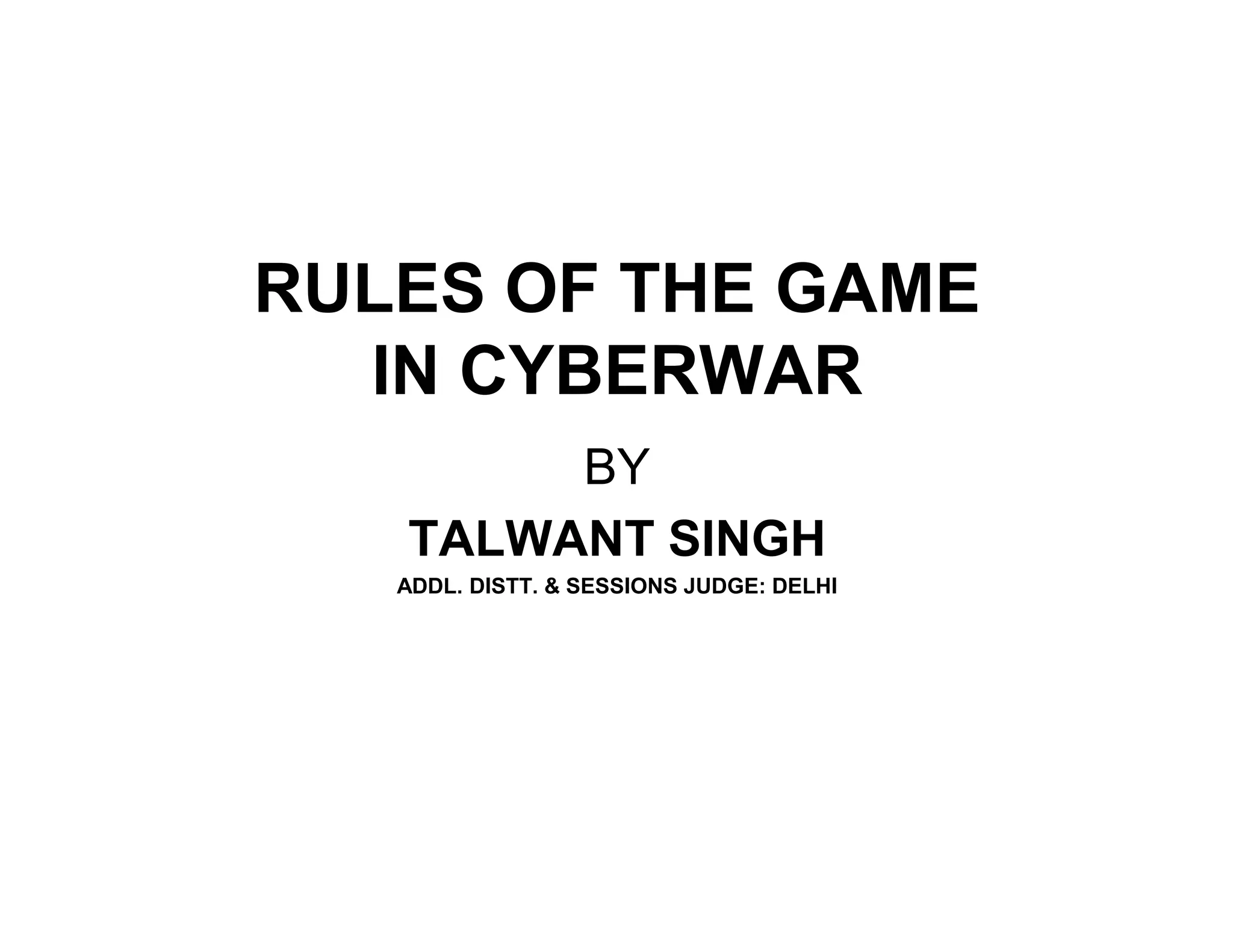 The document discusses the ambiguous definition of 'cyberwar' and contrasting perspectives between nations, notably between Russia and China versus the United States. It emphasizes the urgent need for international rules of engagement in cyberspace to protect essential services and infrastructure while navigating challenges such as attribution and proportional response to cyber attacks. The text also highlights the inadequacy of current laws and standards to address the complexities of cyber conflict and the growing threat posed by both state and non-state actors.
