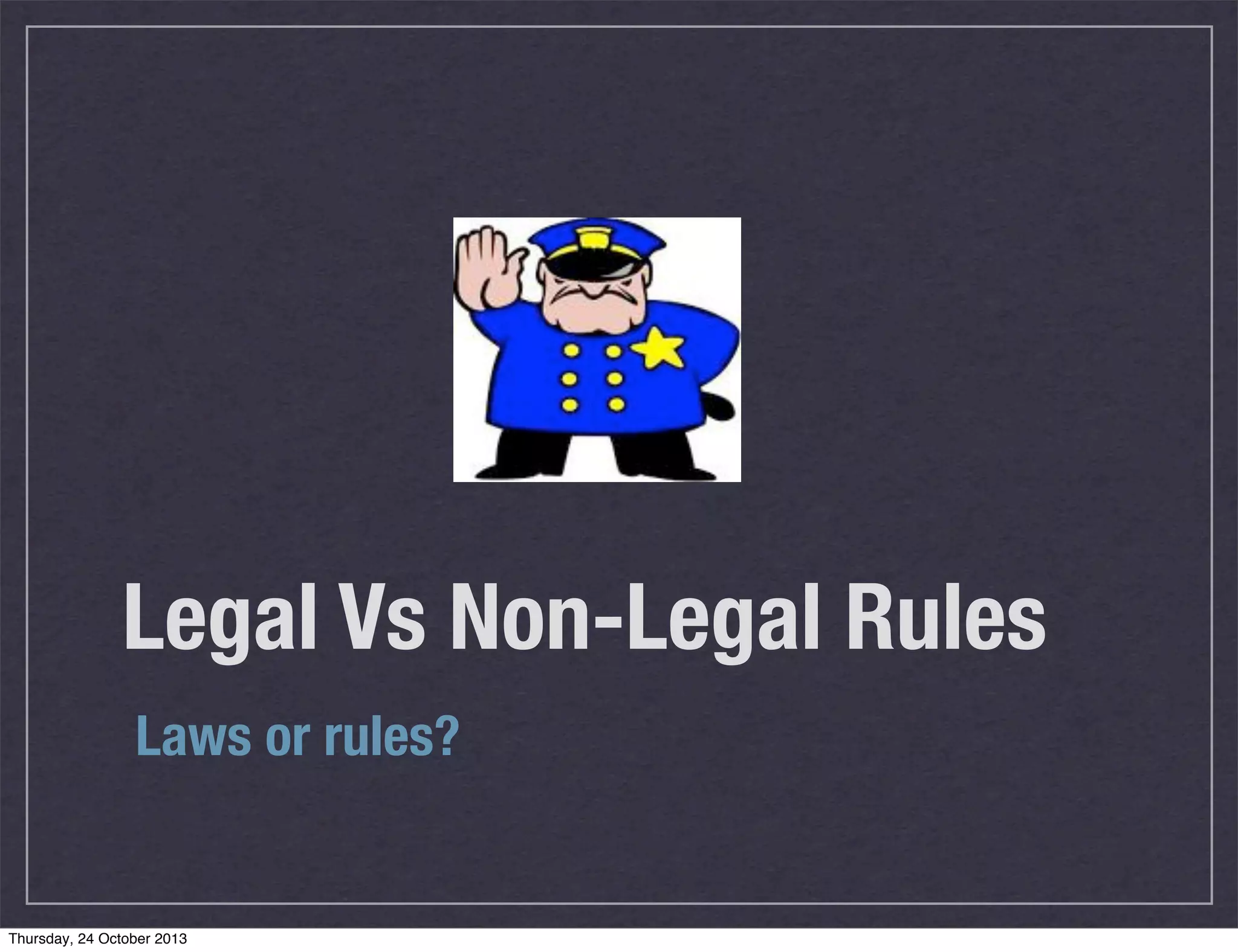 This document discusses the differences between legal laws and non-legal rules. Laws apply to all members of society, are created by law-making bodies, and are always written down. Rules only apply to members of certain groups, can be created by individuals or groups, and do not always need to be written. Examples are given of family rules, cultural norms, morality rules, sports rules, and school rules as types of non-legal rules. The document concludes with an activity asking readers to sort examples into rules or laws and compare family rule lists with a partner.