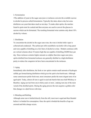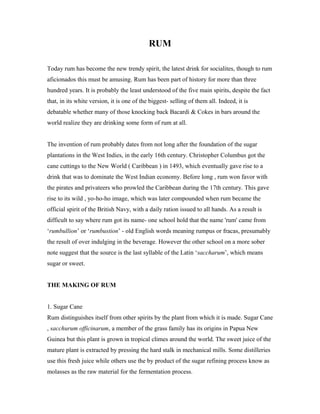 Rum has a long history dating back over 300 years. It originated in the Caribbean from sugar cane plantations in the early 16th century. Rum is produced through the fermentation and distillation of sugar cane juice or molasses. There are many styles of rum from light white rums to dark aged rums. The top rum producing countries are Puerto Rico, Jamaica, Barbados, Cuba, Guyana, Haiti, and others. Popular rum cocktails include the Cuba Libre, Planter's Punch, and Pina Colada.