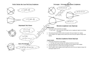 Dokumen ini menjelaskan konsep dan langkah-langkah untuk menggambar lingkaran luar dan dalam segitiga, beserta berbagai rumus matematika yang terkait dengan segitiga dan lingkaran. Selain itu, juga dibahas mengenai volume dan luas permukaan berbagai bangun ruang seperti kubus dan balok. Informasi penting lainnya mencakup hubungan antara sisi segitiga dan jari-jari lingkaran yang berkaitan.