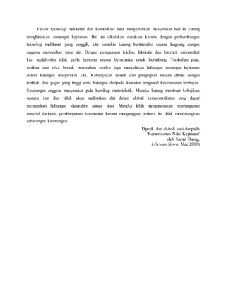 Semangat kejiranan semakin luntur disebabkan oleh tuntutan hidup yang mencabar, sikap individualistik dan kurangnya interaksi yang mesra antara jiran, serta pengaruh teknologi yang mengurangi komunikasi langsung. Faktor-faktor seperti kos sara hidup tinggi dan urbanisasi menyukarkan masyarakat bersatu. Akibatnya, hubungan antara jiran menjadi renggang dan kelekatan sosial dalam masyarakat berbilang kaum berkurangan.