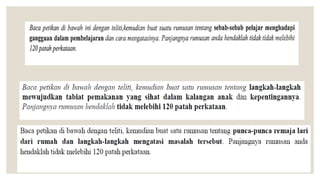Dokumen ini membahas sebab-sebab pelajar mengalami gangguan dalam pembelajaran seperti suasana rumah yang tidak kondusif, kehadiran tetamu tak diundang, kelekaan bermain internet, dan pengaruh teman yang buruk. Dokumen ini juga menyarankan cara-cara mengatasi gangguan pembelajaran seperti berbincang dengan orang tua dan menjauhi teman-teman yang mengganggu saat belajar. Kesimpulannya adalah para pelajar perlu