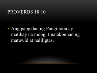 Ang mga talata mula sa Bibliya ay nagtatampok sa kahalagahan ng pangalan ng Panginoon bilang pananggalang para sa mga matuwid at nag-uudyok na ang lahat ng dapat gawin ay gawin sa pangalan ni Jesus. Isinasalaysay din ang isang himala kung saan si Pedro at Juan ay nagpagaling ng isang pilay sa pamamagitan ng pangalan ni Jesus, na nagdulot ng papuri sa Diyos. Ipinapahayag din ng mga talata na ang sinumang tatawag sa pangalan ng Panginoon ay maliligtas.