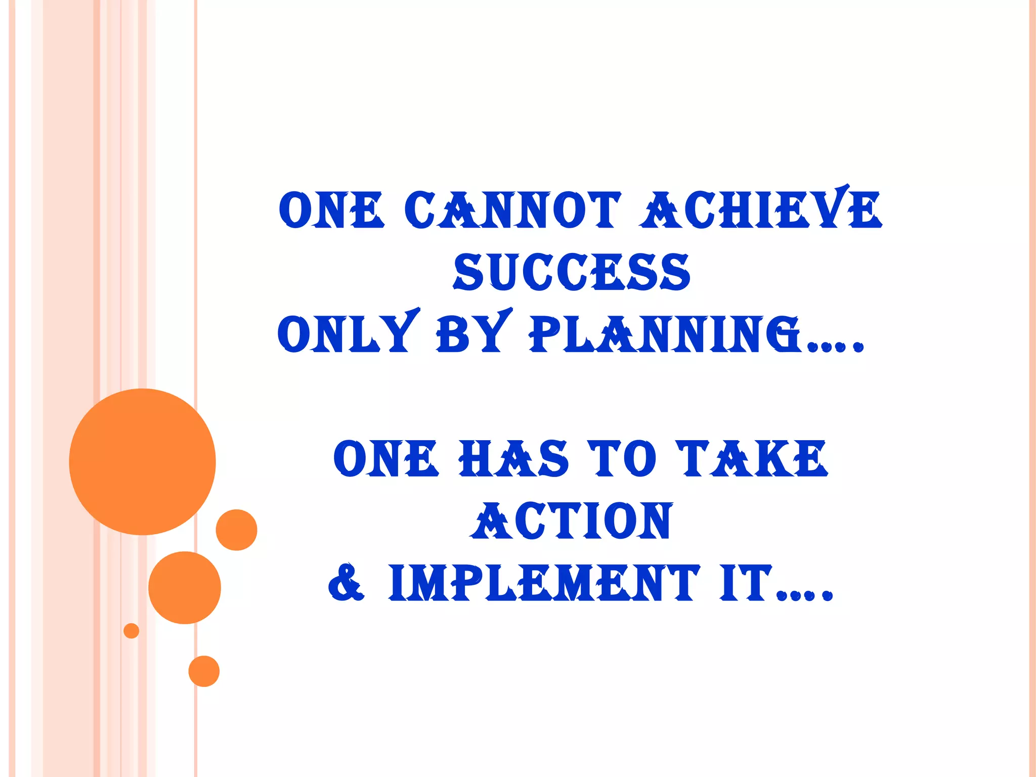 Positive thoughts and taking action on goals are essential to achieving success. Success requires planning but also implementing plans through hard work and not giving up when facing challenges. It is important to learn from successful people and have confidence that continued effort will lead to achieving goals.