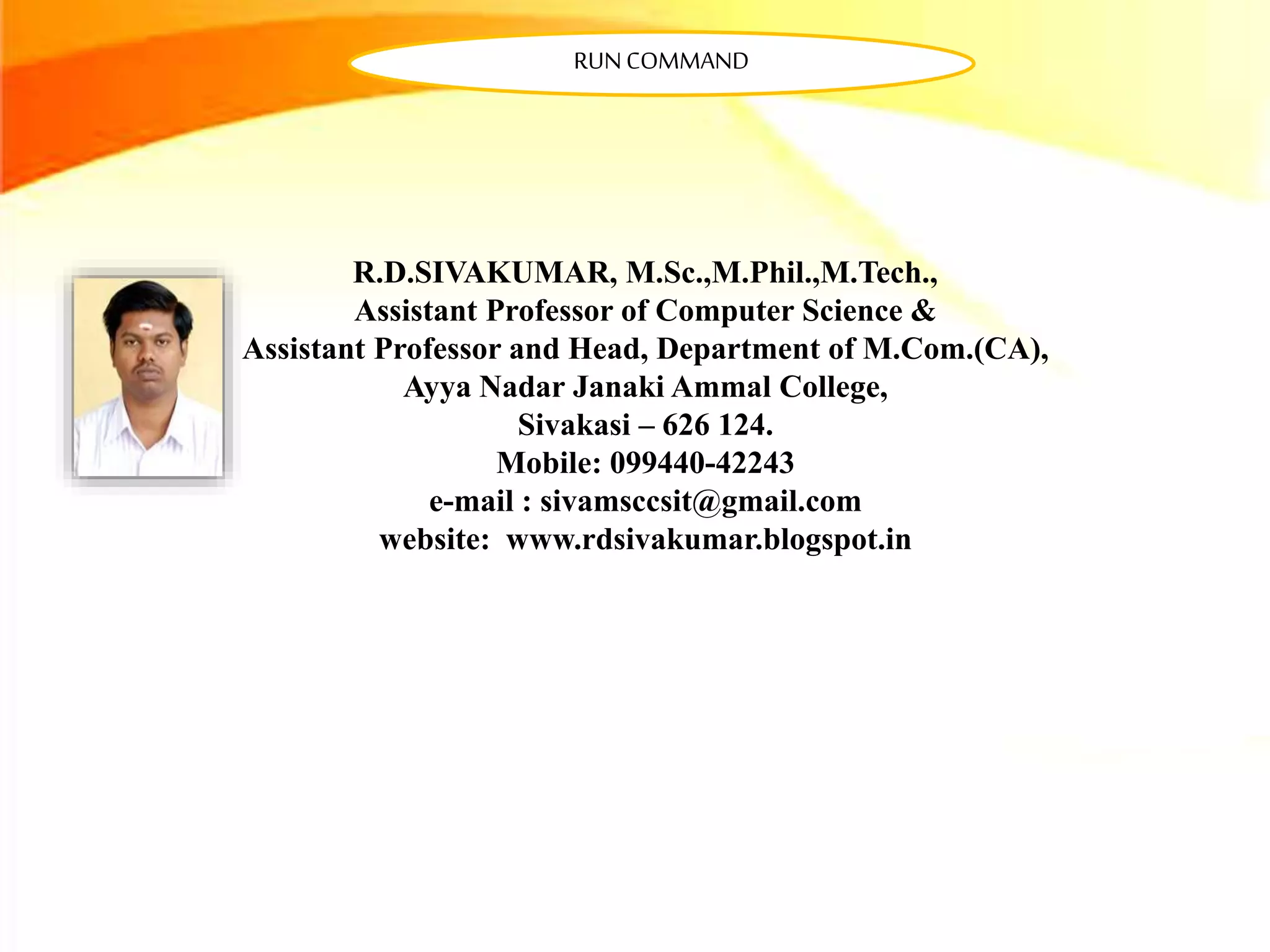 The document provides instructions for using the Run command on the Start menu to open applications and files. The Run command offers an alternative way to launch programs or open data files. When using Run to open a file, it has the advantage of automatically starting the associated application as well. To use Run, click Start and select Run, then type the file name in the Open box, which will display recent files or allow browsing to find one.