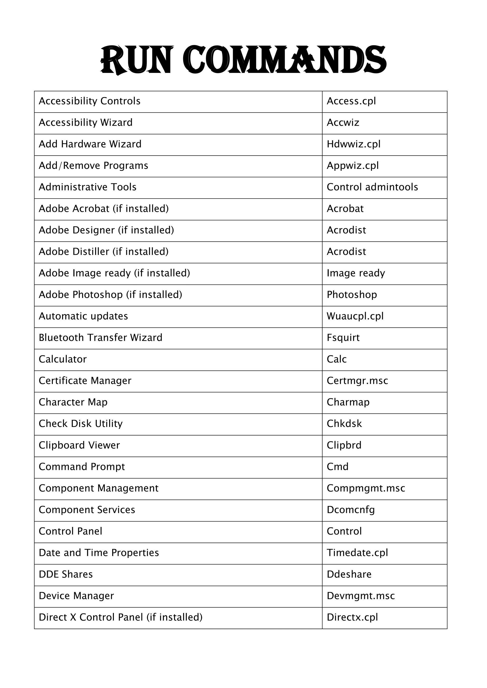 This document contains a list of commands that can be run to access various programs and utilities in Windows. It includes commands to access programs like Control Panel, Calculator, Notepad, as well as system tools like Disk Management, Event Viewer, Task Manager, and IP Configuration utilities.