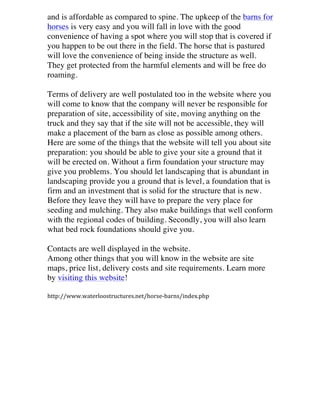 This document discusses run-in horse barns from the website http://www.waterloostructures.net/horse-barns/index.php. It summarizes that the website offers prefabricated run-in horse barns that provide shelter for horses during bad weather and storms. The barns come in a variety of sizes from 6x8 feet to 12x48 feet and materials like duratemp or pine. They are sturdily constructed and easy to maintain. The website also details terms of delivery and requirements for site preparation prior to barn installation.