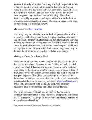 Run-in sheds are structures with three closed sides and an open front used to shelter horses. They are built from locally available materials and are relatively easy to construct. Ideally, a run-in shed for horses has two compartments - an open area for the horse and a closed area for storing hay and feed. The location of a run-in shed should be dry, high ground not prone to flooding. Waterloo Structures provides a wide range of ready-to-assemble and permanent run-in shed designs and sizes for customers.