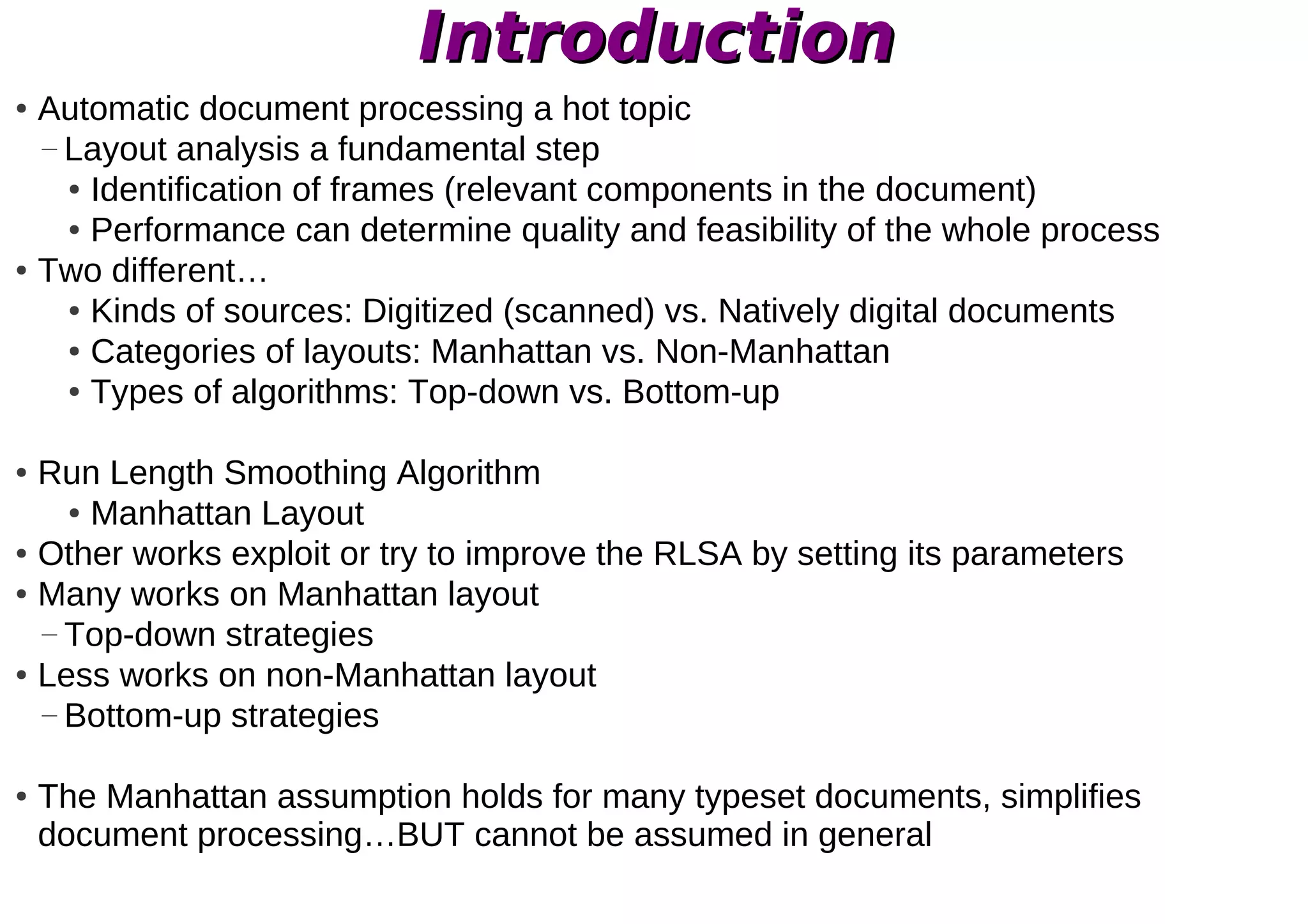 The document discusses a run length smoothing-based algorithm for document segmentation, primarily focusing on both manhattan and non-manhattan layouts. It outlines the challenges of automatic document processing and the need for effective threshold settings in smoothing algorithms, particularly for digitized and born-digital documents. The research highlights the significance of automatic threshold assessment to improve the algorithm's performance in identifying relevant document frames.