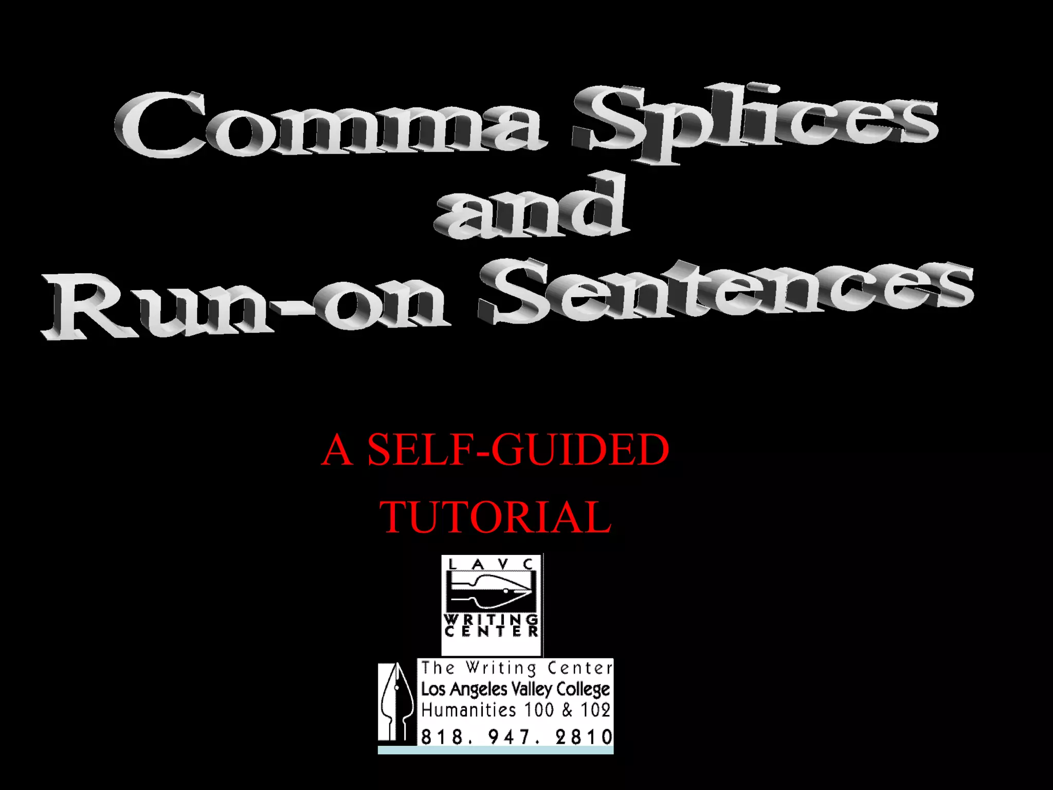 This tutorial discusses run-on sentences and comma splices, specifically how to identify and fix them. It defines key terms like subjects, verbs, clauses, and punctuation like commas and semicolons. It explains that run-on sentences and comma splices occur when two independent clauses are incorrectly joined without proper punctuation. The presentation teaches that independent clauses should be joined using a period, semicolon, or coordinating conjunction followed by a comma.