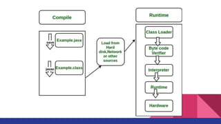 The document discusses the key differences between the Java Development Kit (JDK), Java Runtime Environment (JRE), and Java Virtual Machine (JVM). The JVM is an abstract machine that provides a runtime environment for executing Java bytecode. The JRE implements the JVM and contains libraries and files needed at runtime. The JDK includes the JRE plus development tools like a compiler and debugger. It also explains the runtime data areas of the JVM, including the heap, method area, and stacks that are used by threads.