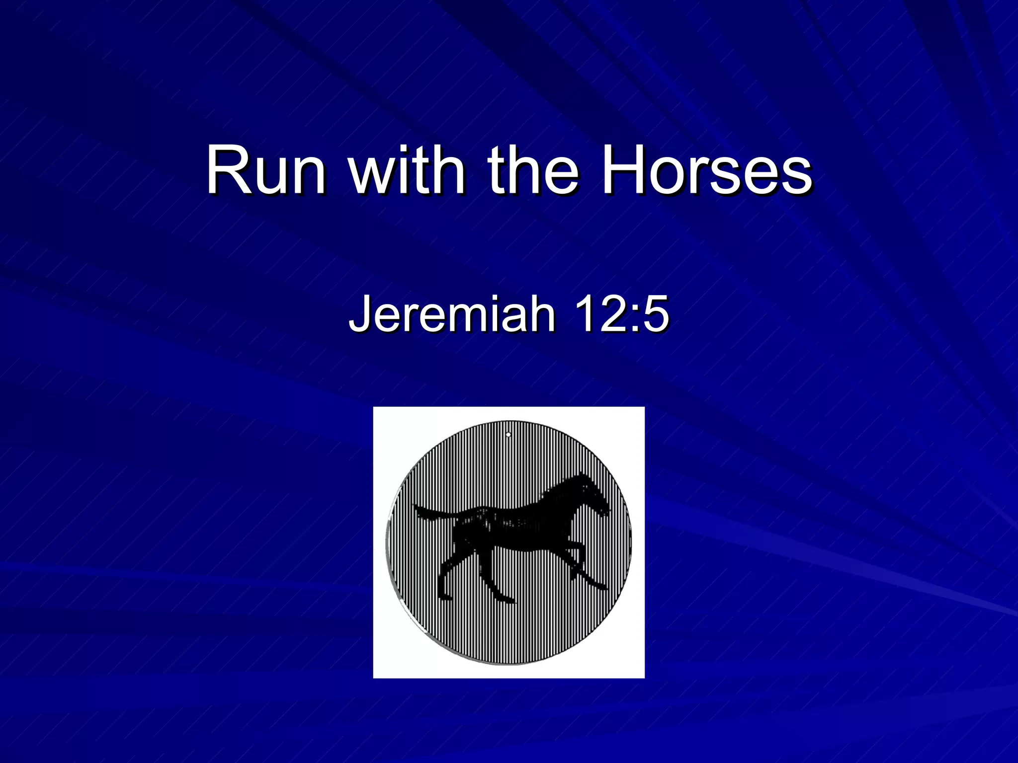 The document discusses Jeremiah 12:5 and the spiritual lessons from Jeremiah's life and ministry. It provides context on Jeremiah's times including the kings of Judah. The passage compares Jeremiah facing greater opposition to competing with horses after being worn out racing men on foot. It suggests Jeremiah will face more struggles as he continues prophesying God's judgment. However, God has helped Jeremiah with past problems and will do so in the future, as God is sovereign and with Jeremiah. The lessons are that God strengthens us through difficulties and will not allow problems greater than we can handle.