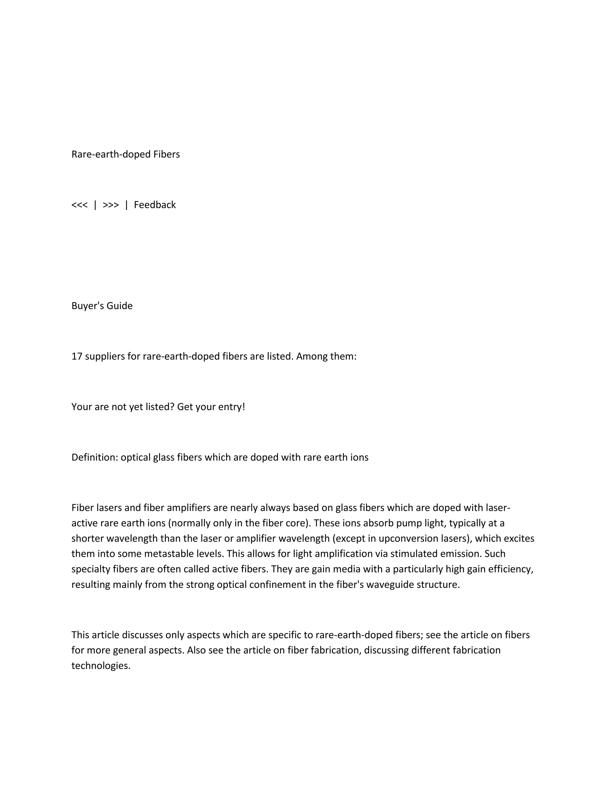 Rare-earth-doped fibers are optical glass fibers doped with rare earth ions that are commonly used in fiber lasers and amplifiers. They absorb pump light which excites the rare earth ions, allowing for light amplification via stimulated emission. The most important rare-earth-doped fibers are erbium-doped fibers for erbium-doped fiber amplifiers and ytterbium-doped fibers for high-power fiber lasers and amplifiers. Rare-earth-doped fibers are characterized by their doping concentration, absorption and emission cross-sections, and upper-state lifetime.