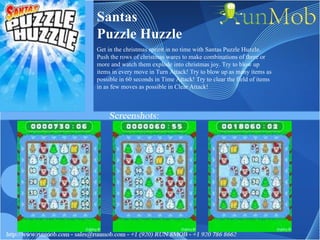 Santas Puzzle Huzzle is a puzzle game where the player pushes rows of Christmas items to make combinations of three or more to clear the board. It includes different game modes like Time Attack. Santa's Sleigh Ride has the player help Santa deliver presents while avoiding naughty houses and hazards. Santa's Puzzle Party involves interchanging ornaments on a board to make combinations of three that disappear.