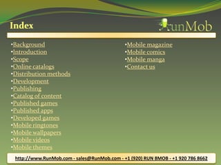 RunMob is a leading mobile entertainment provider that develops, publishes, and distributes a wide variety of mobile content across different platforms. This includes mobile games, apps, videos, music, magazines, comics and more. RunMob works with carriers and operators to provide this content and aims to make it available on as many devices as possible. It utilizes various distribution methods including preloading on devices, app stores, online hosting, and partnerships with TV stations, media companies, and ISPs.