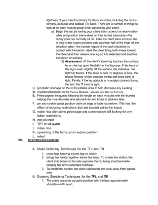 Runners knee, also known as patellofemoral pain syndrome, is a condition where the patellar cartilage becomes irritated from contact with the femoral cartilage. It is commonly caused by overuse from activities like running that place stress on the knee joint. Specifically, it can result from overloading from excess weight, poor biomechanics, muscular imbalances, tight hip flexors, and other factors. A 24-year old cross country runner presented with knee pain diagnosed as runners knee. The treatment plan focused on equalizing tension on the patella, retraining the knee extensors, soft tissue work including myofascial release and stretching of the hips and quads, and exercises before progressing to full weight bearing and return to activity