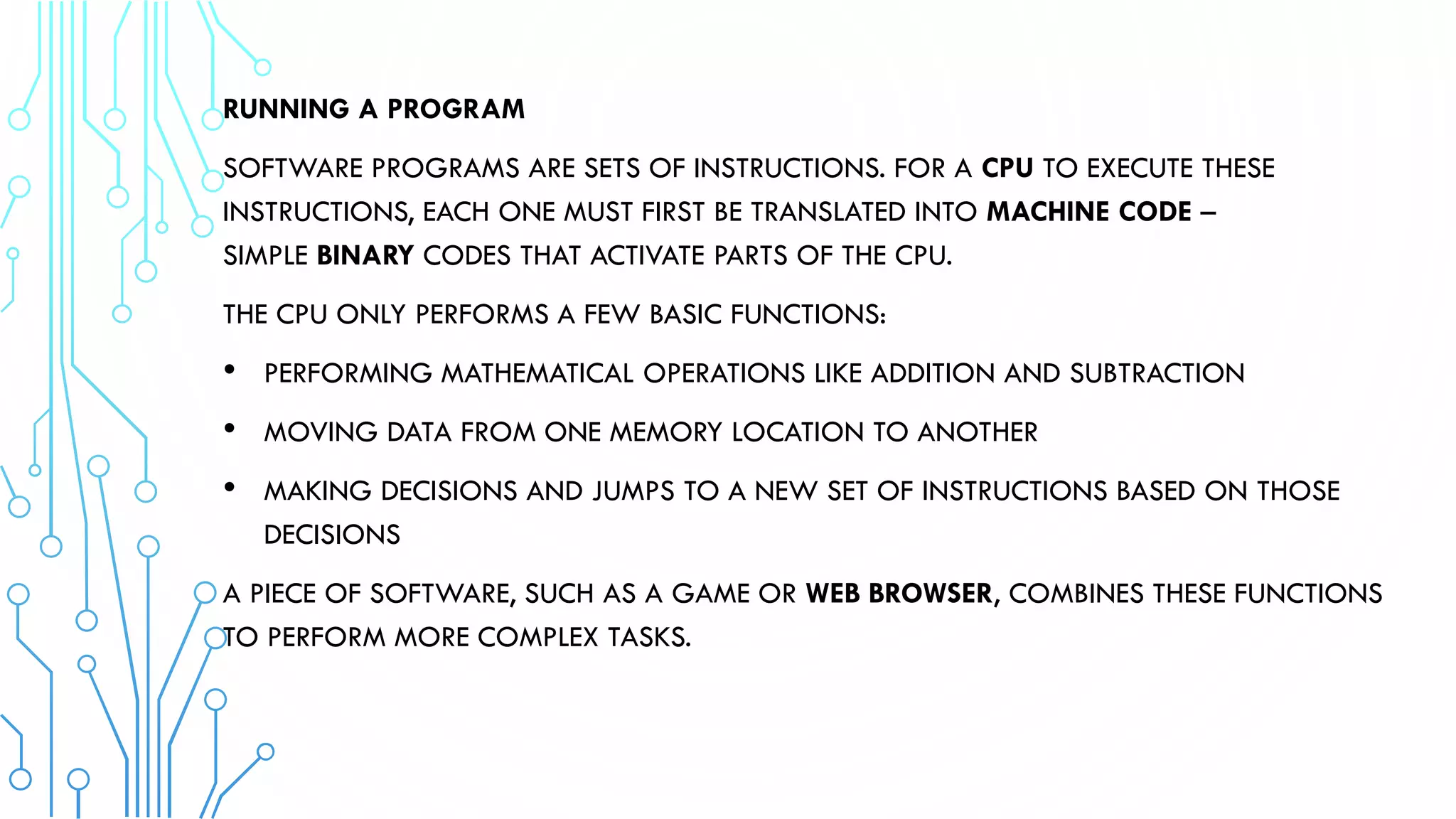 Software programs are sets of instructions that must be translated into machine code before the CPU can execute them. The CPU performs basic functions like arithmetic, data movement, and decision making to carry out more complex tasks as specified by software programs. It executes programs through a fetch-decode-execute cycle, fetching instructions from memory based on the program counter before decoding and carrying out each one.