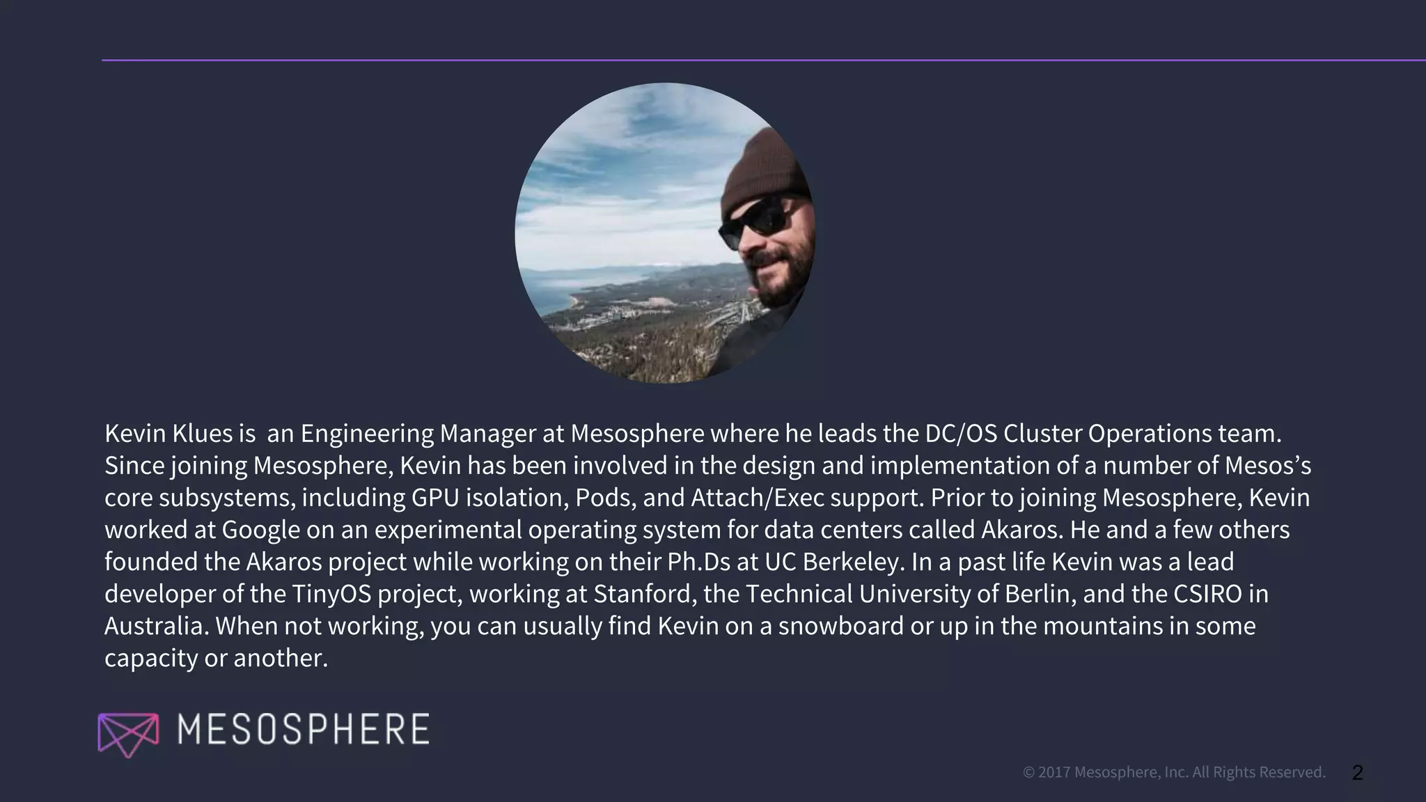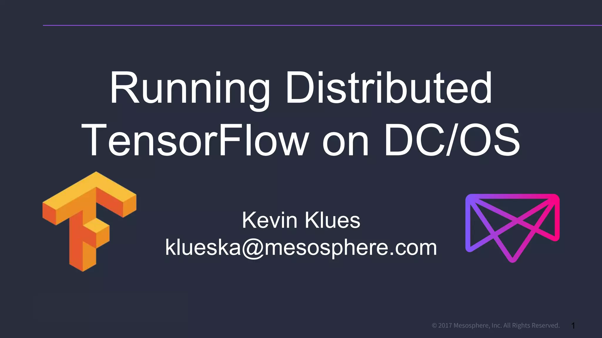 This document discusses running distributed TensorFlow jobs on the DC/OS platform. It begins with an overview of typical TensorFlow development workflows for single-node and distributed training. It then outlines some challenges of running distributed TensorFlow, such as needing to hard-code cluster configuration details. The document explains how DC/OS addresses these challenges by dynamically generating cluster configurations and handling failures gracefully. It demonstrates deploying non-distributed and distributed TensorFlow jobs on a DC/OS cluster to train an image classification model.