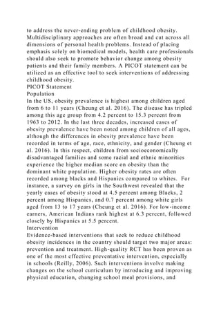 The document discusses childhood obesity as a significant health concern in the U.S., emphasizing the need for effective interventions and policies to address its rising prevalence, particularly among disadvantaged populations. It highlights the importance of multidisciplinary approaches to prevention and treatment and mentions various evidence-based strategies, including dietary changes and increased physical activity. The document concludes that collaboration among healthcare providers, parents, and communities is essential for fostering healthier lifestyles and ultimately reducing obesity rates in children.