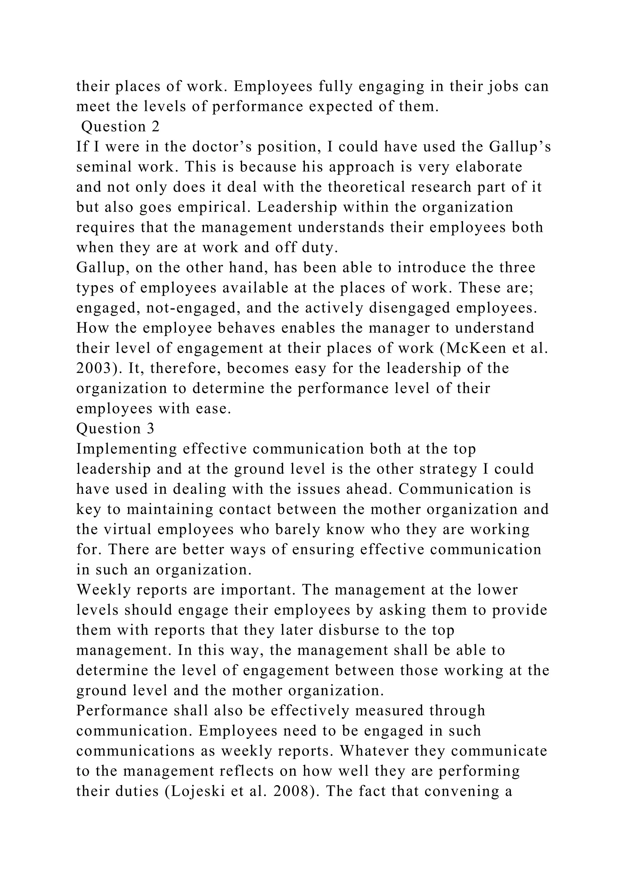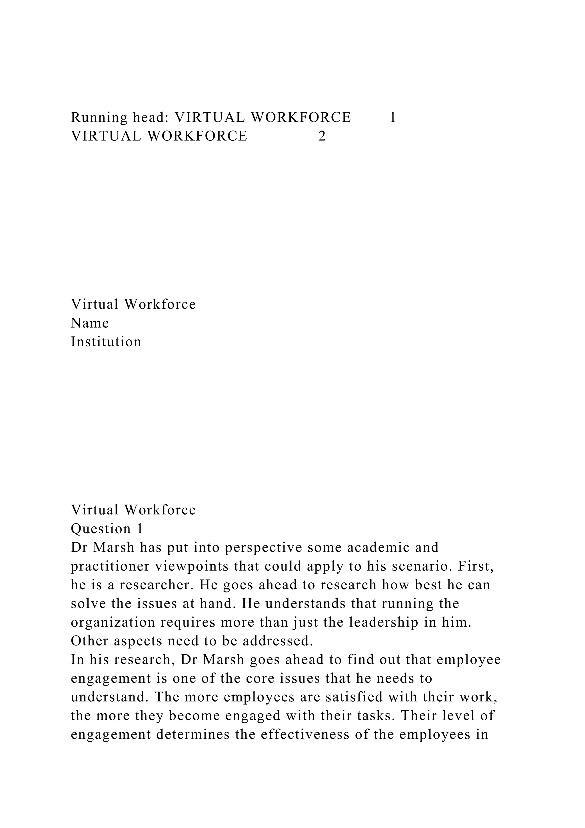 Dr. Marsh is researching how to address issues at his organization, including low employee engagement. Research shows engagement affects performance. If he were in Dr. Marsh's position, the author would use Gallup's work on engaged, not engaged, and actively disengaged employees to understand performance levels. Effective communication between leadership and employees is also important, such as weekly employee reports, to measure engagement and performance in a virtual workforce.