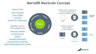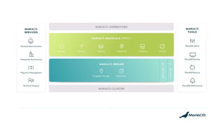 The document discusses running MariaDB across multiple data centers. It begins by outlining the need for multi-datacenter database architectures to provide high availability, disaster recovery, and continuous operation. It then describes topology choices for different use cases, including traditional disaster recovery, geo-synchronous distributed architectures, and how technologies like MariaDB Master/Slave and Galera Cluster work. The rest of the document discusses answering key questions when designing a multi-datacenter topology, trade-offs to consider, architecture technologies, and pros and cons of different approaches.